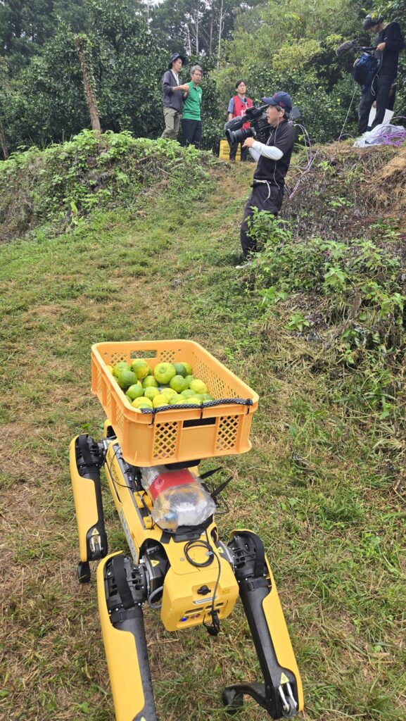 高知県安芸市の千光士農園にあるこれまでにない傾斜地でしたが、収穫運搬支援については何度か発表してきたので今回はNHK向けに新しい映像ソースとして軽トラから出撃するSpotを開発しました。